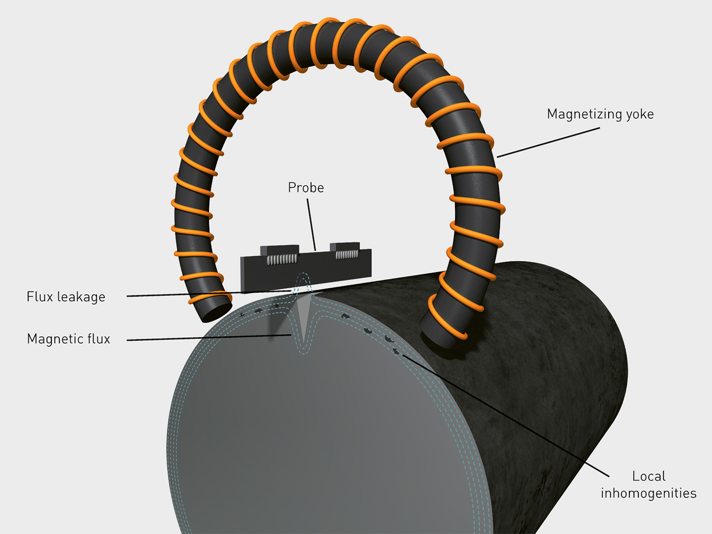 In magnetic flux leakage testing, a strong magnetic field is applied to magnetize ferromagnetic materials such as steel. In flawless areas, the magnetic flux flows uniformly through the material. Defects such as corrosion, pits, or wall-thickness variations disturb this flow, causing magnetic field lines to leak out at the surface.